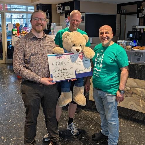 Michael Cremann (Fundraiser, Deutscher Kinderhospitzdienst), Uwe Weckelmann (Leiter Kommunikation, SV Westfalen), Hope (Botschafter, Deutscher Kinderhospitzdienst), Ümit Acar (1. Vorsitzender, SV Westfalen und Betreiber des Bistrocafé Südbad)