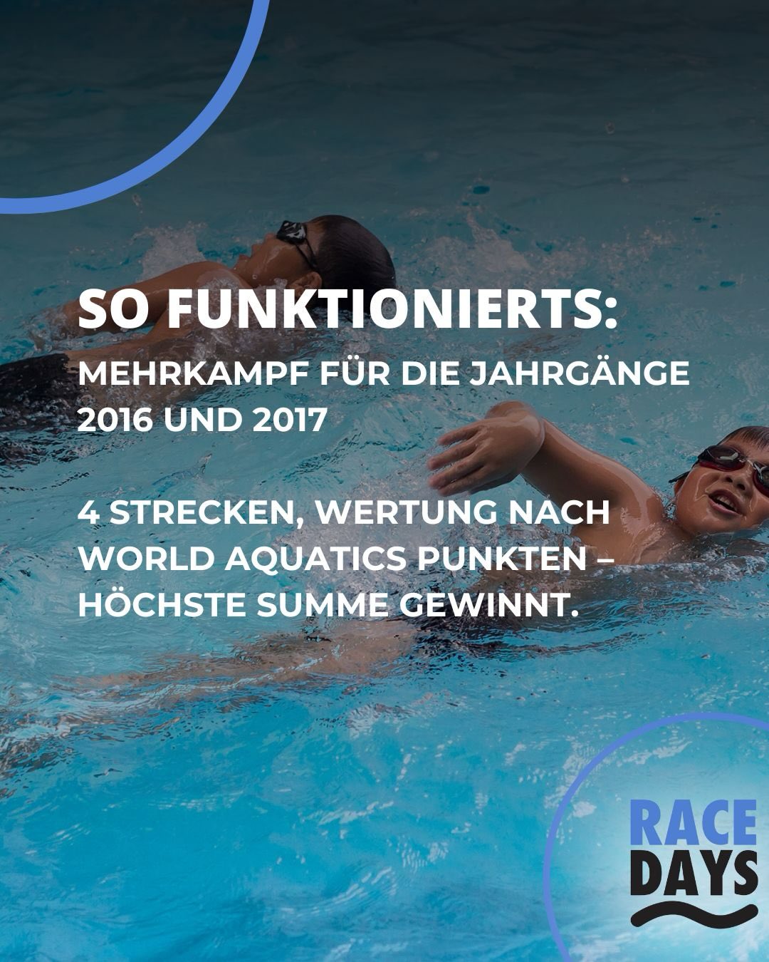 Die Jahrgänge 2016 und 2017 treten in einem Mehrkampf aus 200m Freistil, 100m Rücken, 100m Brust und 50m Schmetterling an.