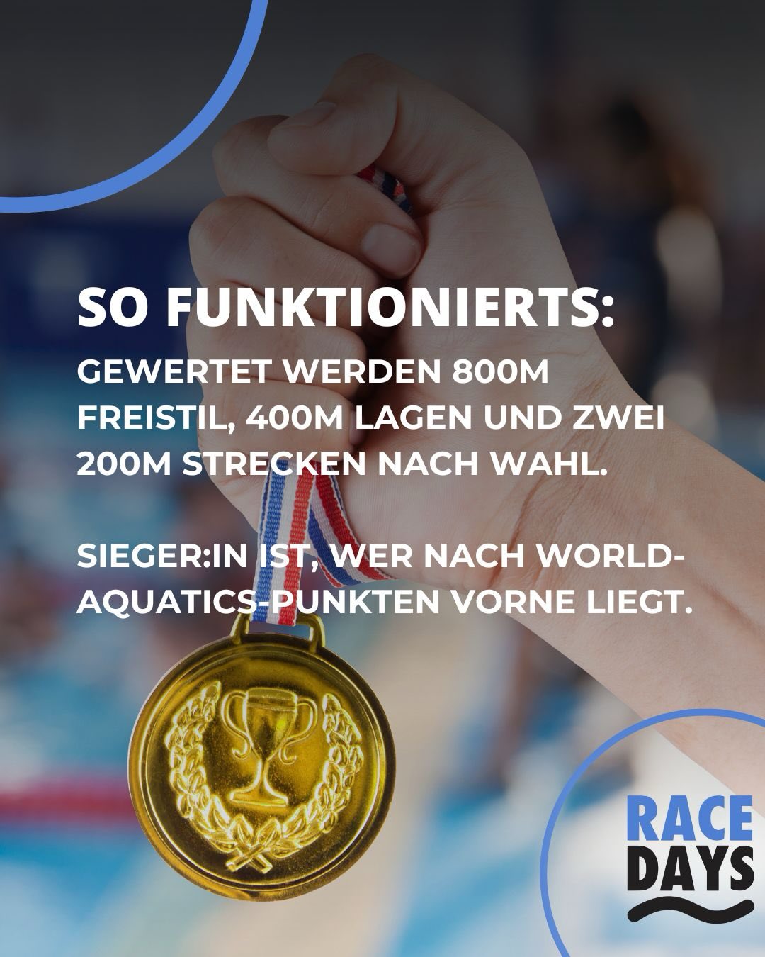 Siegerin oder Sieger ist, wer nach 400 Metern die meisten Punkte gesammelt hat. Hier sind Ausdauer, Renneinteilung und Köpfchen entscheidend. 🏊🏼
