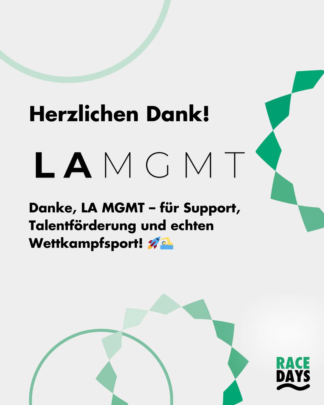 Mit starker Unterstützung von LA MGMT wachsen die Swim Race Days 2025 weiter und setzen neue Maßstäbe im Schwimmsport. Ihr Engagement ermöglicht die Förderung junger Talente, den Ausbau professioneller Strukturen und eine erstklassige Wettkampfatmosphäre. Gemeinsam bringen wir den Schwimmsport nach vorn!
