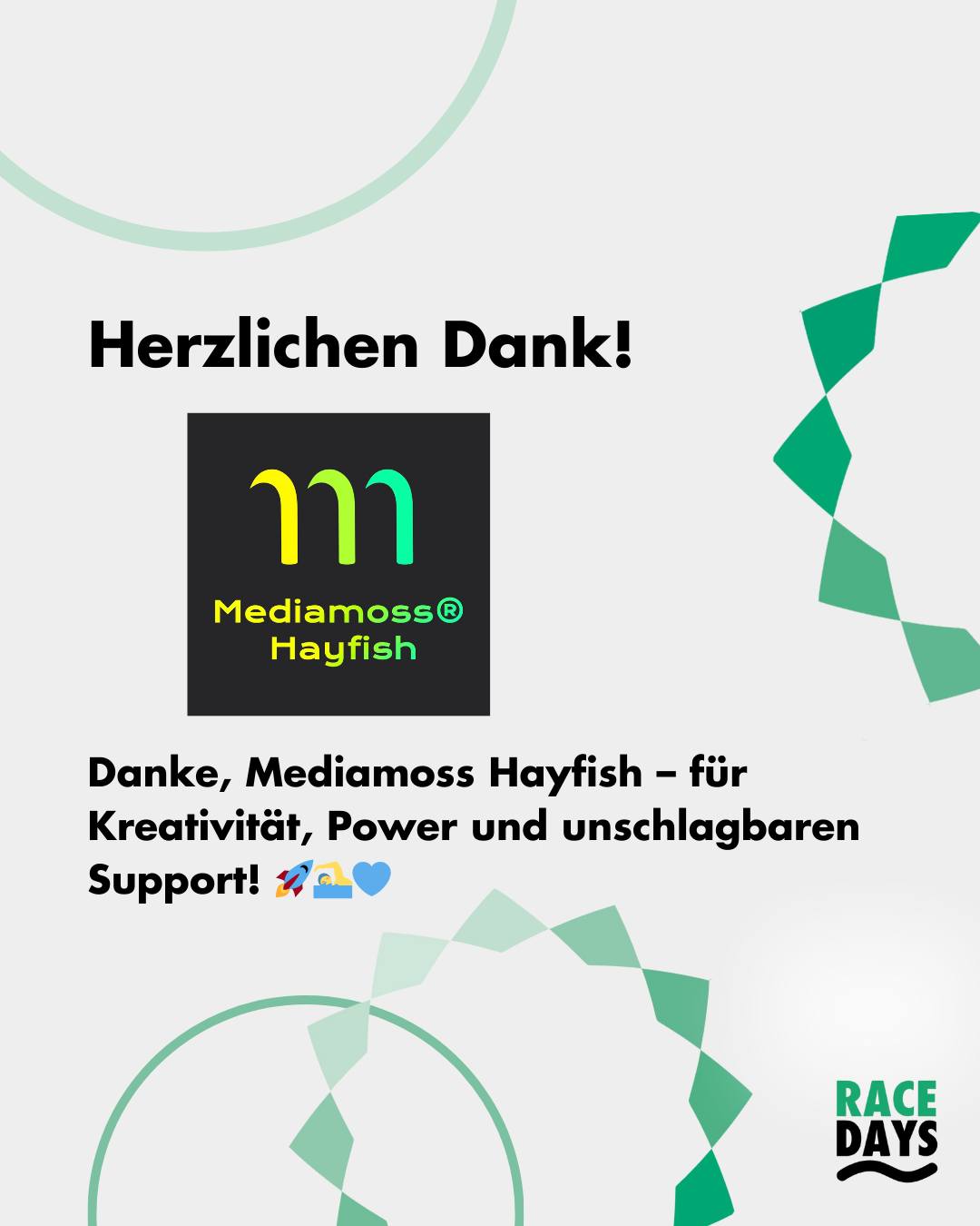 Was wären die Swim Race Days 2025 ohne ein großartiges Team im Hintergrund? Mediamoss mit der Marke Hayfish hat uns mit unermüdlichem Einsatz, kreativen Ideen und echtem Herzblut unterstützt. Dank euch strahlen unsere Inhalte, wachsen unsere Reichweite und wird der Schwimmsport perfekt in Szene gesetzt.